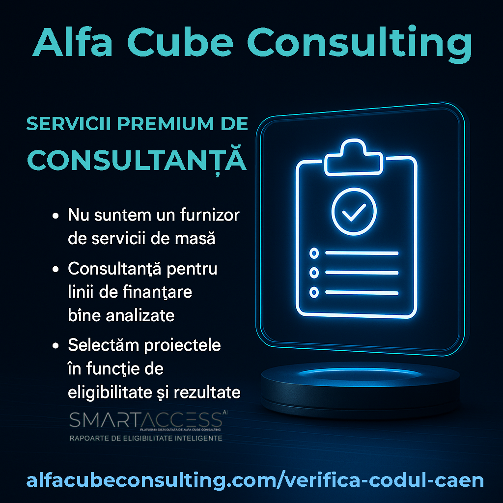Alfa Cube Consulting este o companie specializată exclusiv în consultanță pentru fonduri europene, activă atât în sectorul privat, cât și în cel public. Cu o echipă dedicată și o abordare premium, gestionăm în prezent un portofoliu de proiecte în valoare totală de peste 100 de milioane de euro în ultimii doi ani, oferind asistență directă pentru peste 100 de clienți – de la IMM-uri la UAT-uri și instituții publice.
