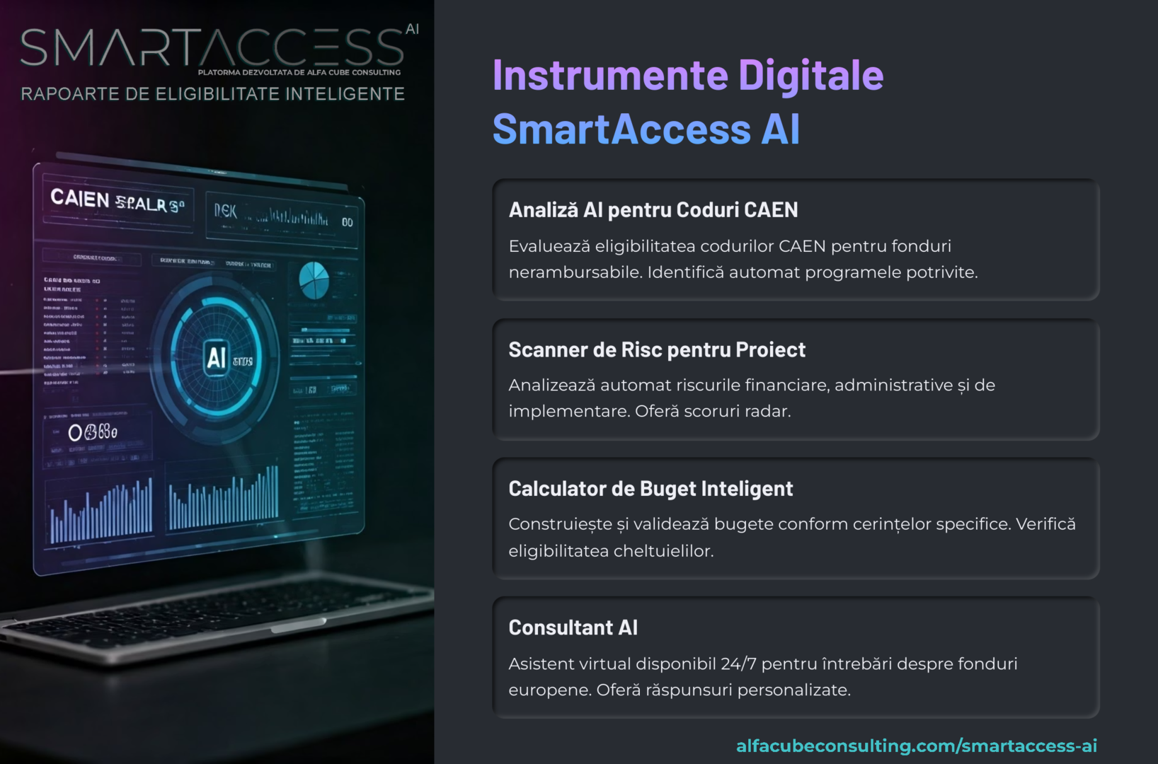 🤖 Inovație cu sens Suntem singura companie din România care dezvoltă și aplică soluții proprii de analiză inteligentă prin SmartAccess AI – o platformă care automatizează procese-cheie precum: ✅ Verificarea eligibilității în funcție de cod CAEN și regiune ✅ Analiza riscurilor și scorurilor de finanțare ✅ Simulări de cash flow și sustenabilitate ✅ Recomandări AI pentru planificare strategică