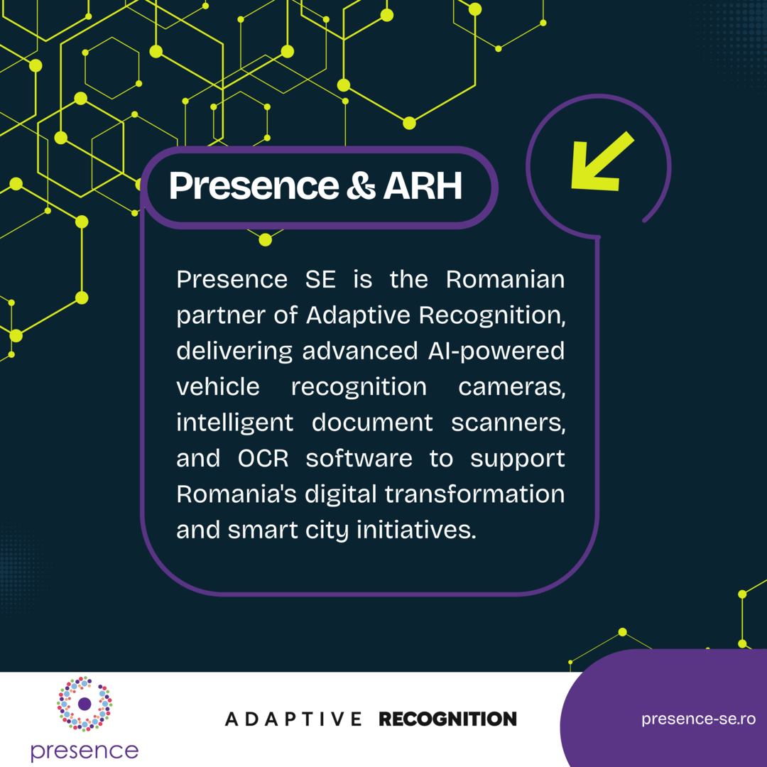 Înființată în 2018, Presence SE este distribuitorul unic în Romania a Adaptive Recognition | ARH începând din anul 2025, companie lider în tehnologia de recunoaștere optică a caracterelor (OCR) și soluții de captare și analiză a imaginilor. Adaptive Recognition dezvoltă hardware și software de ultimă generație pentru recunoașterea automată a plăcuțelor de înmatriculare, scanere de documente de identitate, camere ANPR, precum și soluții inteligente pentru controlul accesului, monitorizarea traficului și verificarea identității.